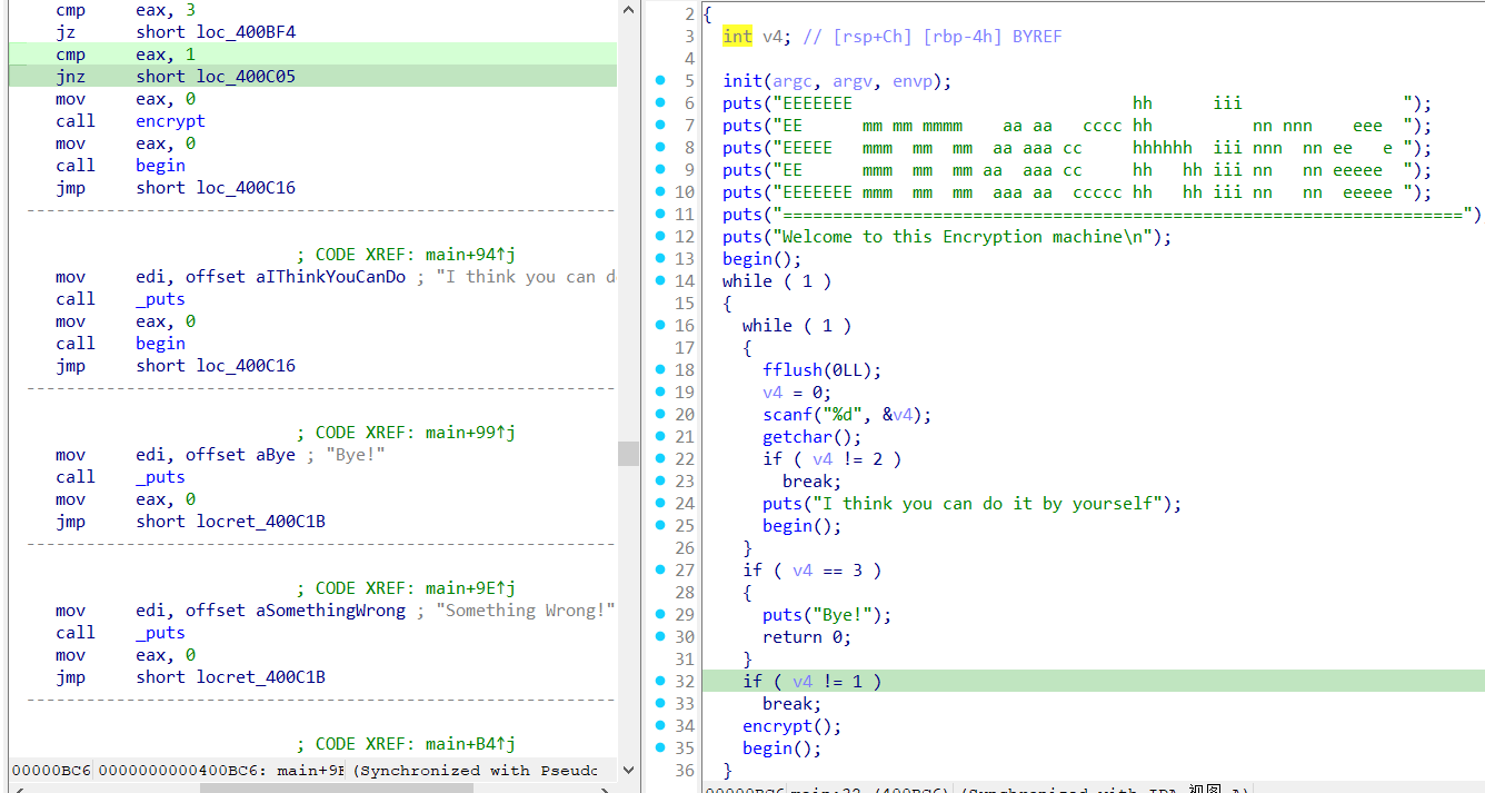 看到main中是一个while循环,当输入的值为1的时候,进入到encrypt函数