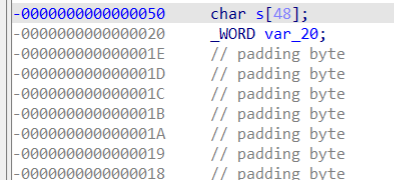 双击数组s,可以看到长度为0x50 ,又因为64位程序,我们加入8即可到达返回地址