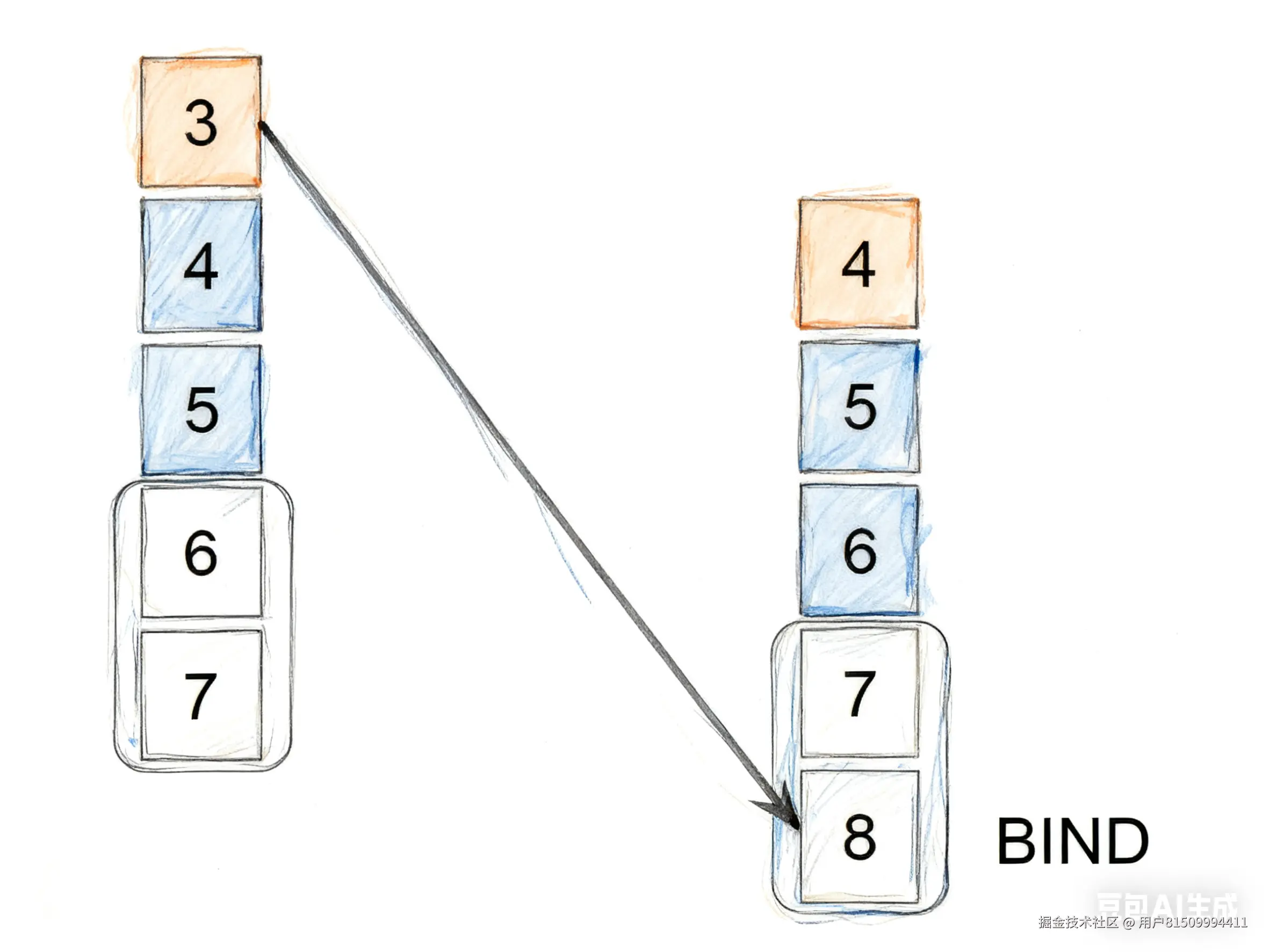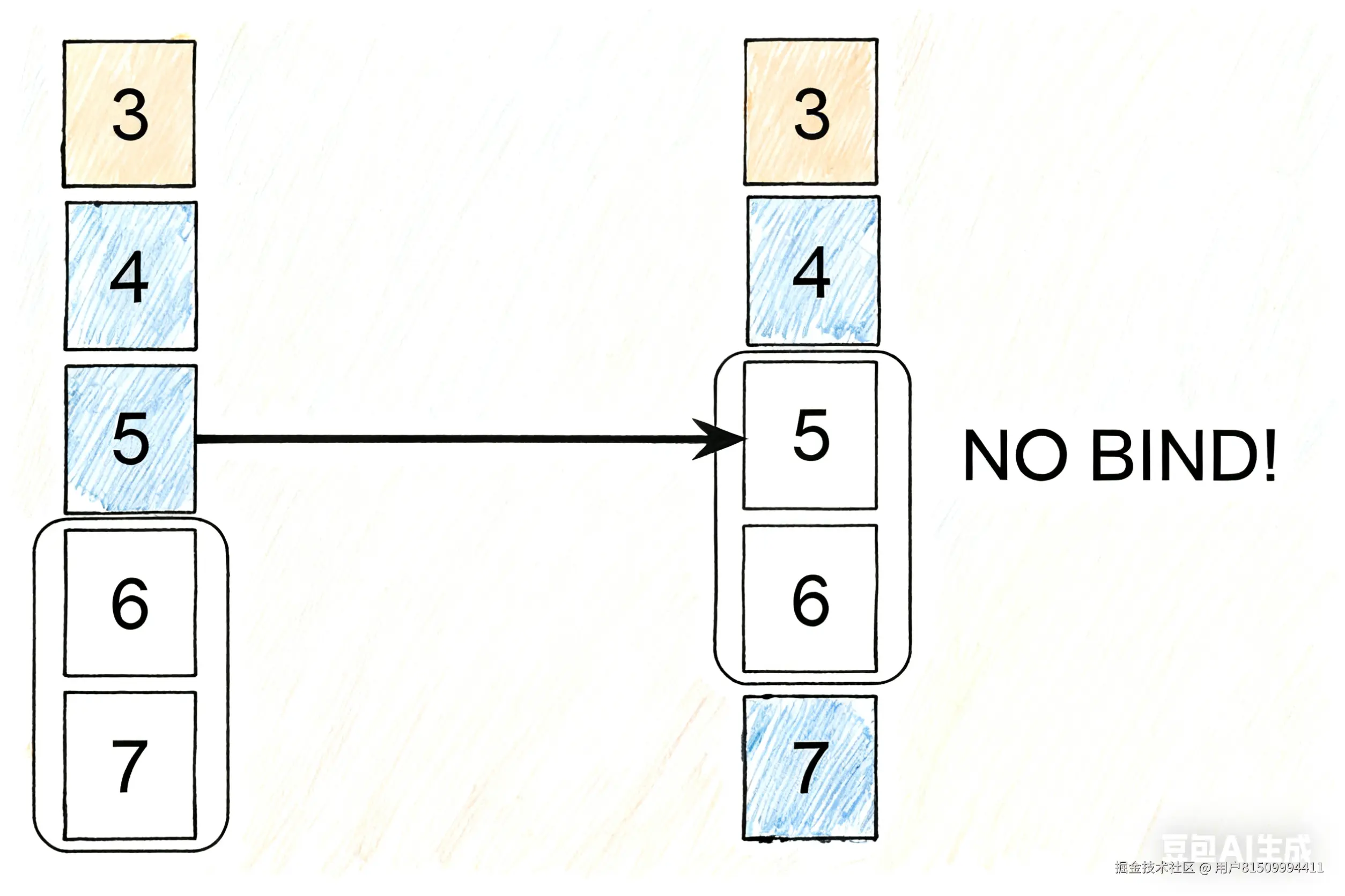 当我们向下滚动时,当前显示的项目后面会有一段"尾巴",由缓存的项目和一个池化项目组成。当项目 8 出现在屏幕上时,缓存中找不到合适的 ViewHolder:没有与位置 8 关联的 ViewHolder。因此,我们使用之前位于位置 3 的池化 ViewHolder。当顶部的项目 6 消失时,它会被放入缓存,并将项目 4 推入池中。