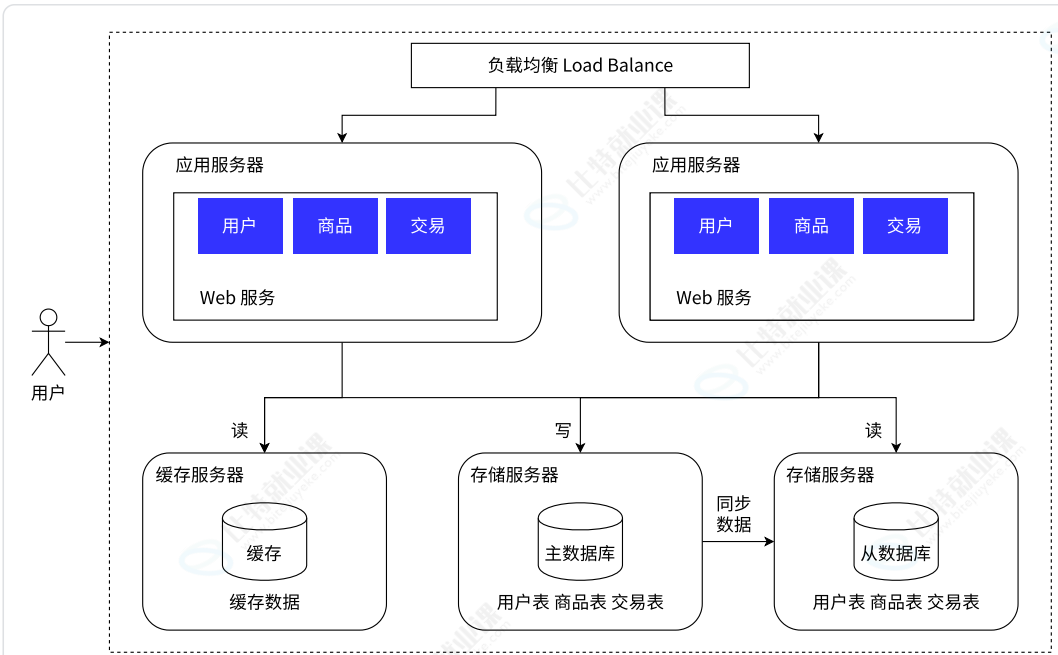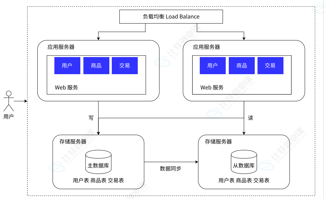 3.读写分离: 读数据库与写数据库分离, 这是因为上面处理业务的应用服务器引入了多台, 可以处理大量业务, 所以对数据读与写也要跟上, 单一的数据库服务器同时进行读与写已经显露疲态, 这时我们就需要将读与写服务器分离