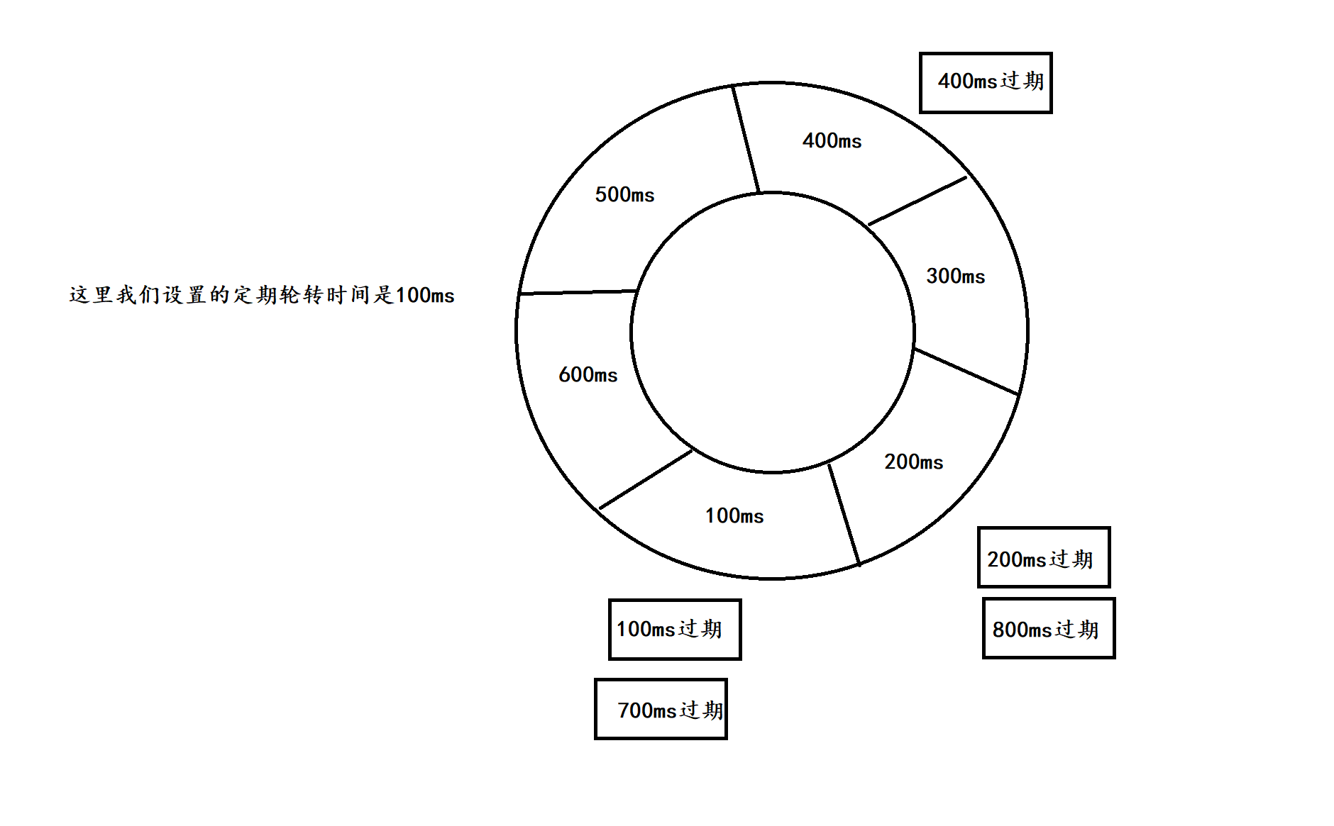 时间轮的概念就是将一段时间划分为很多小段(具体划分的粒度看实际需求), 每一小段时间后面连接是一个定时任务组成的链表, 然后设置一个定期的轮转间隔, 时间到了之后指针会从一个时间段调到下一个时间段, 然后一个线程会扫描该时间段挂载的整个链表, 尝试执行其中的定时任务, 之所以是'尝试'执行是因为有可能有的key过期时间过长, 轮转完一圈没有它的位置, 这时候就需要过期时间减去轮转时间继续向后寻找找到它应该待的位置, 这就可能导致同一个时间段中同一个链表中可能包含过期时间差距较大的任务, 指针每隔固定的间隔就轮转一次, 不停旋转