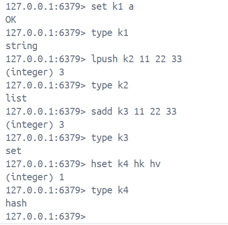 查询key对应val的数据类型, 时间复杂度为O(1), 已知在Redis中key的数据类型只有string, 但是val的数据类型就有很多了:如string字符串, list列表, set集合, zset有序集合, hash哈希表, stream流(Redis作为消息队列的时候会使用这个类型)