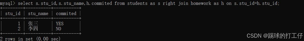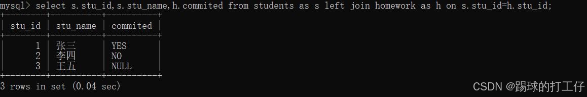 注:这次我们使用了inner join,这个表示取交集的意思。看到区别了没有,students表中stu_id为3的值没有取出来,因为在homework表中没有stu_id为3的数据;同样的,homework表中stu_id为4的值也没有取出来,因为在students表中没有stu_id为4的数据。