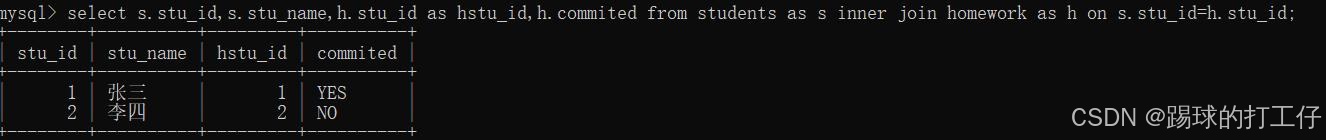select s.stu_id,s.stu_name,h.stu_id as hstu_id,h.commited from students as s inner join homework as h on s.stu_id=h.stu_id;