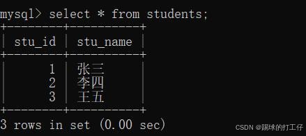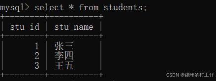 我们设置两个表,一个students表,有学生id字段stu_id,学生姓名字段stu_name;