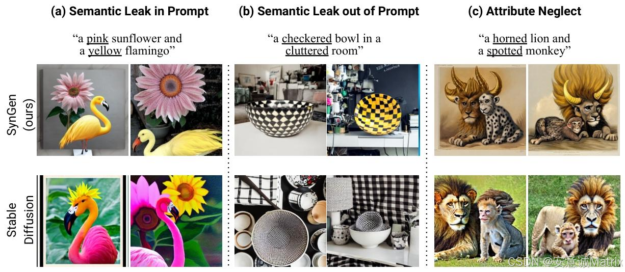 - 语义泄露:修饰词错误迁移到其他实体(如"粉色向日葵+黄色火烈鸟"生成黄色向日葵),或迁移到 prompt 未提及的物体;