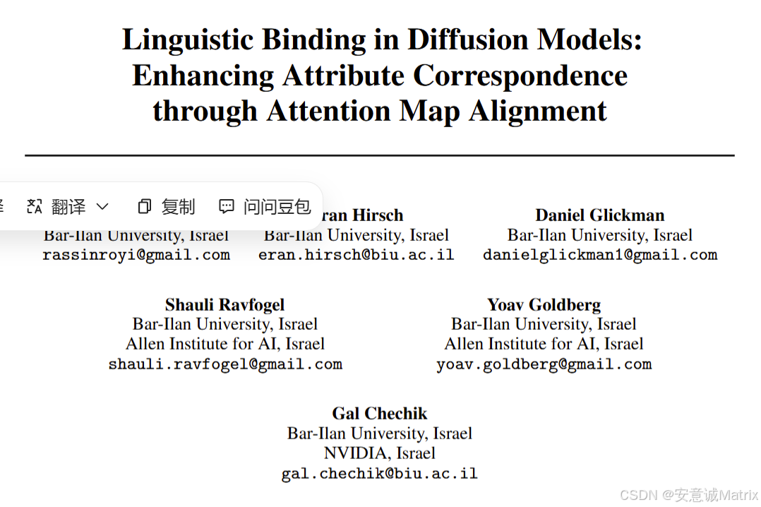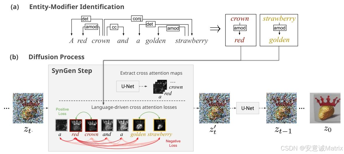 通过句法分析提取实体-修饰词关系 ,再通过注意力图对齐损失,在推理阶段引导扩散模型的视觉绑定匹配语言绑定(无需重训练模型)。