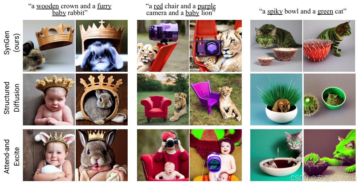 - 优化目标:Attend-and-Excite的损失目标是"确保指定实体token的注意力存在",聚焦解决"实体遗漏"问题;而SynGen的损失目标是"对齐实体-修饰词的注意力图、分离与无关词的注意力图",直接针对"实体-属性绑定错误";