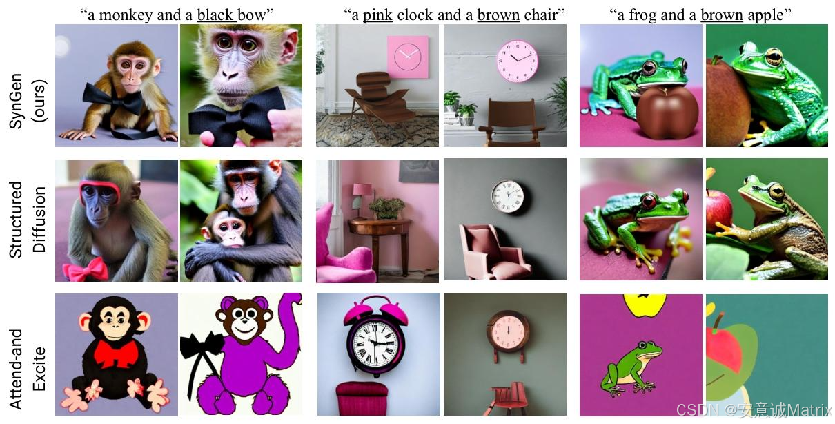 - 语义泄露:如"粉色时钟+棕色椅子",基线将粉色误用于椅子,SynGen正确绑定;