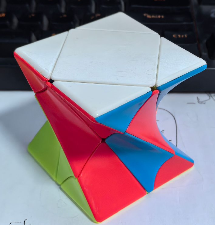 和斜转魔方唯一的区别就是,有4个中心块(蓝绿红橙)是扭曲的,也就是要区分朝向了。