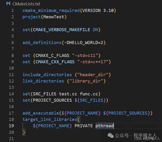 第18行的target_link_libraries用于指令链接哪些库,类似于命令行中的-l。