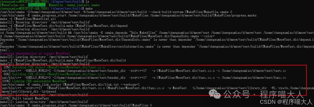 因为我打开了VERBOSE,所以这里可以看到详细的命令信息,你也完全可以复制上面的命令来执行,也可以生成可执行程序的。