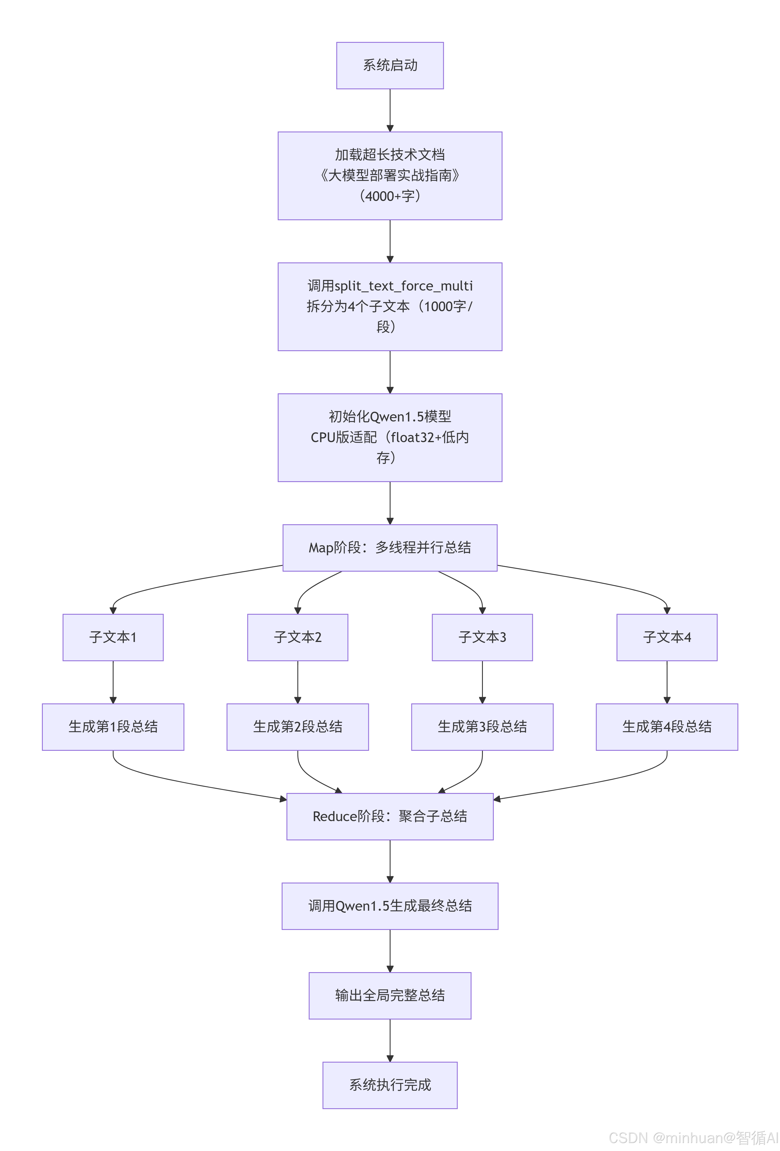 - 分治拆解:将 4000 + 字超长文档拆分为 4 个子文本(1000 字 / 段),避免单进程处理超长文本导致的内存溢出 / 推理超时
