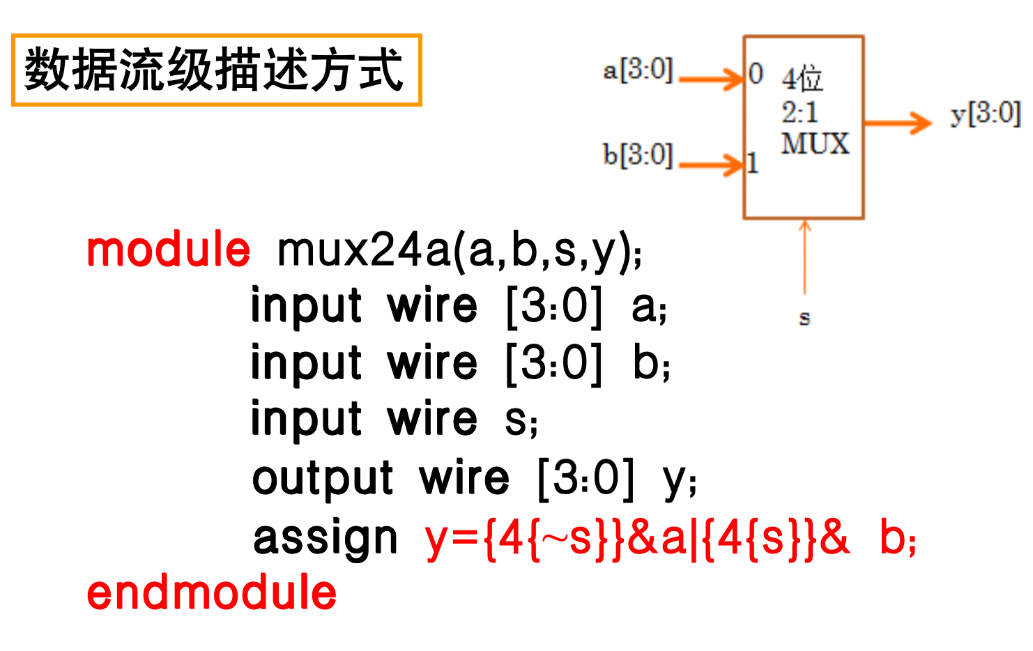 verilogmodule mux21a(a,b,s,y); input a, b, s; output y; assign y=(~s&a)|(s&b); endmodule -