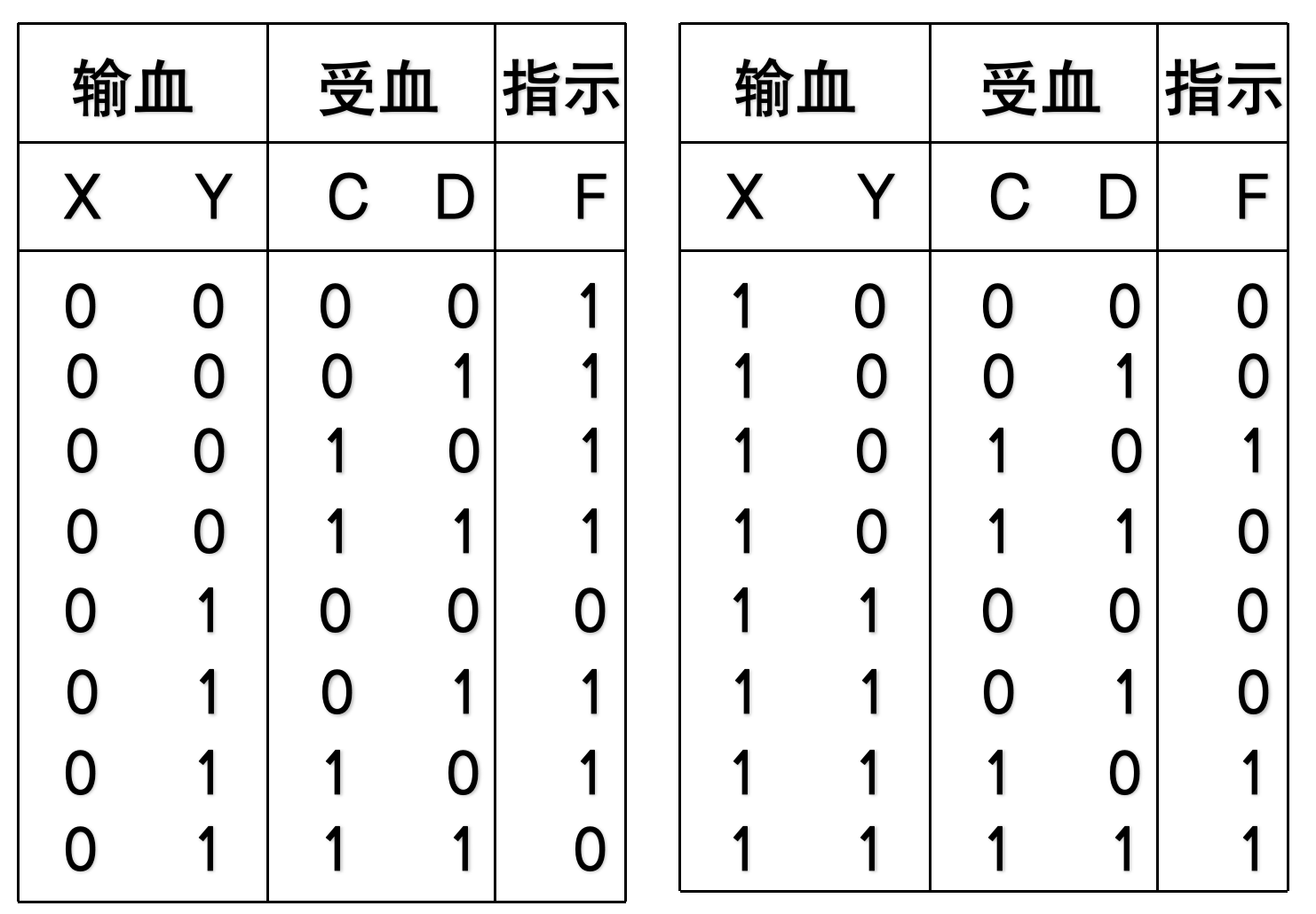 - 只要血型相同就可以输,即XY=CD,则F=1;