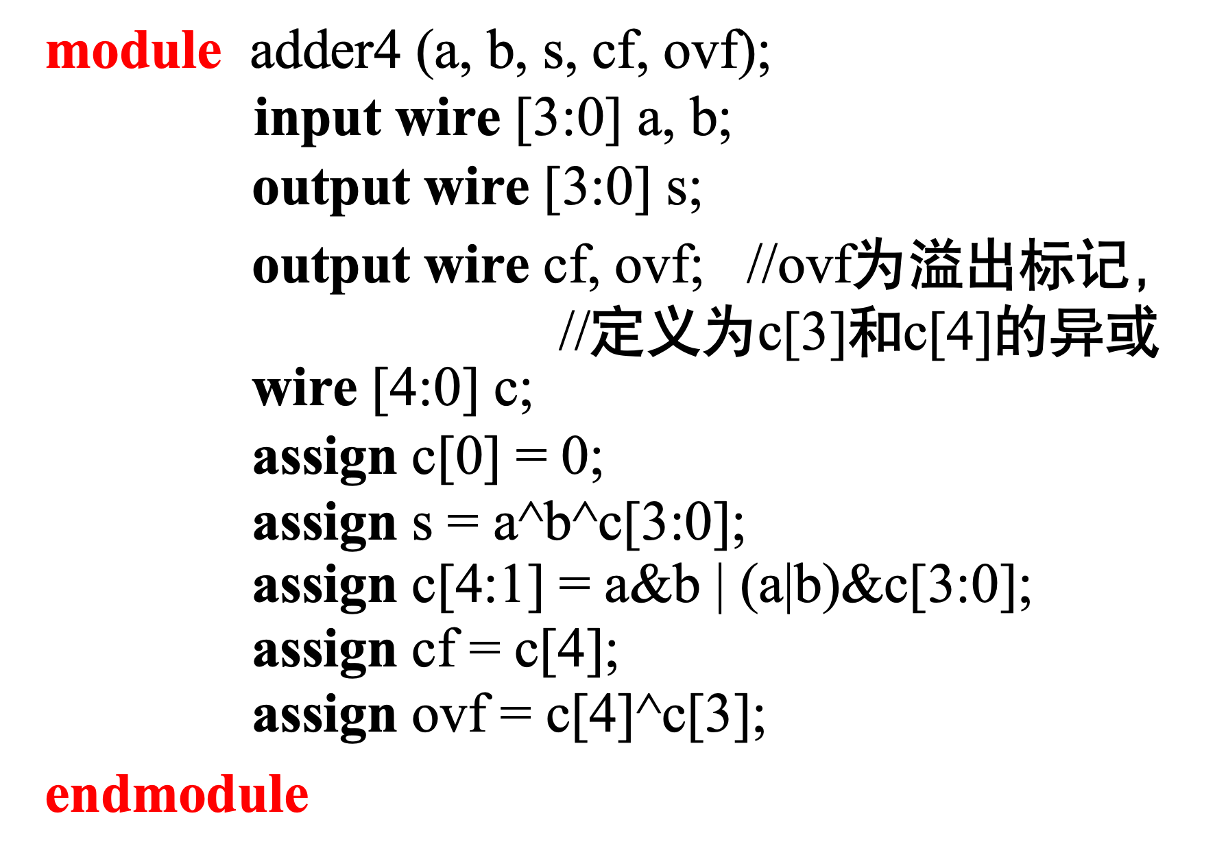 verilogmodule adder4 (a, b, s, cf, ovf); input wire [3:0] a, b; output wire [3:0] s; output wire cf, ovf; /*ovf为溢出标记,定义为c[3]和c[4]的异或*/ wire [4:0] c; assign c[0] = 0; assign s[0] = a[0]^b[0]^c[0]; assign c[1] = a[0]&b[0] | (a[0]|b[0])&c[0]; assign s[1] = a[1]^b[1]^c[1]; assign c[2] = a[1]&b[1] | (a[1]|b[1])&c[1]; assign s[2] = a[2]^b[2]^c[2]; assign c[3] = a[2]&b[2] | (a[2]|b[2])&c[2]; assign s[3] = a[3]^b[3]^c[3]; assign c[4] = a[3]&b[3] | (a[3]|b[3])&c[3]; assign cf = c[4]; assign ovf = c[4]^c[3]; endmodule-