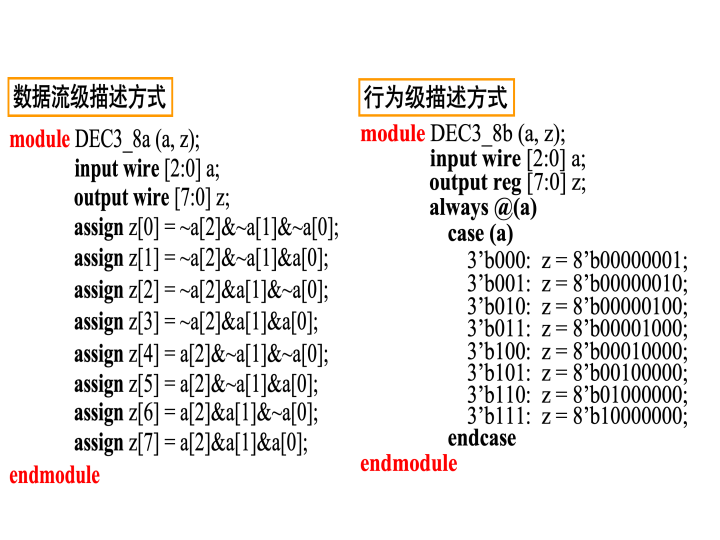 verilogmodule DEC3_8a_top( input wire[2:0] sw, output wire[7:0] ld ); DEC3_8a D1(.a(sw), .z(ld)); endmodule