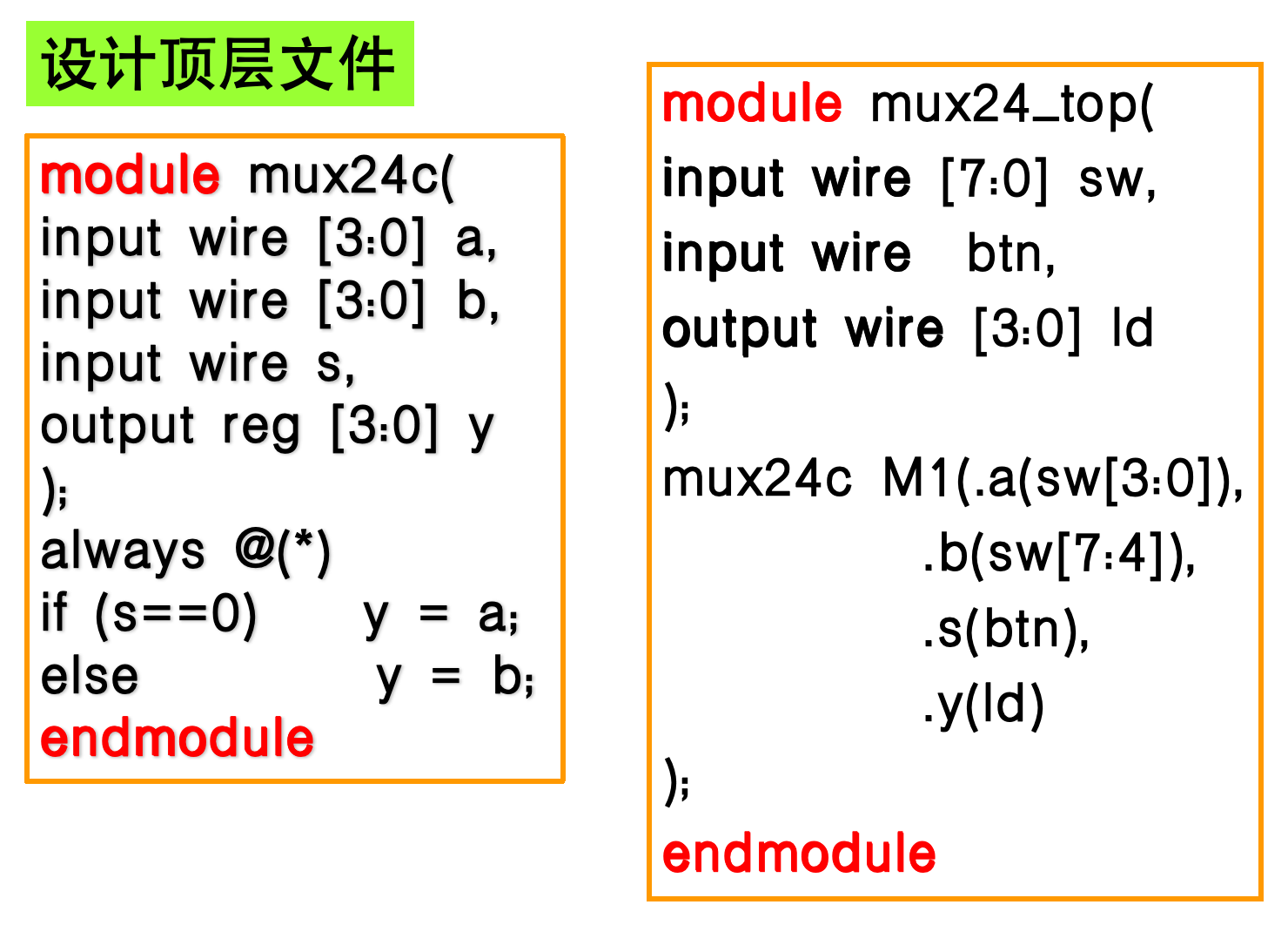 verilogmodule mux21_top( input wire [1:0] sw, input wire btn, output wire ld ); mux21c M1(.a(sw[0]), .b(sw[1]), .s(btn), .y(ld) ); endmodule