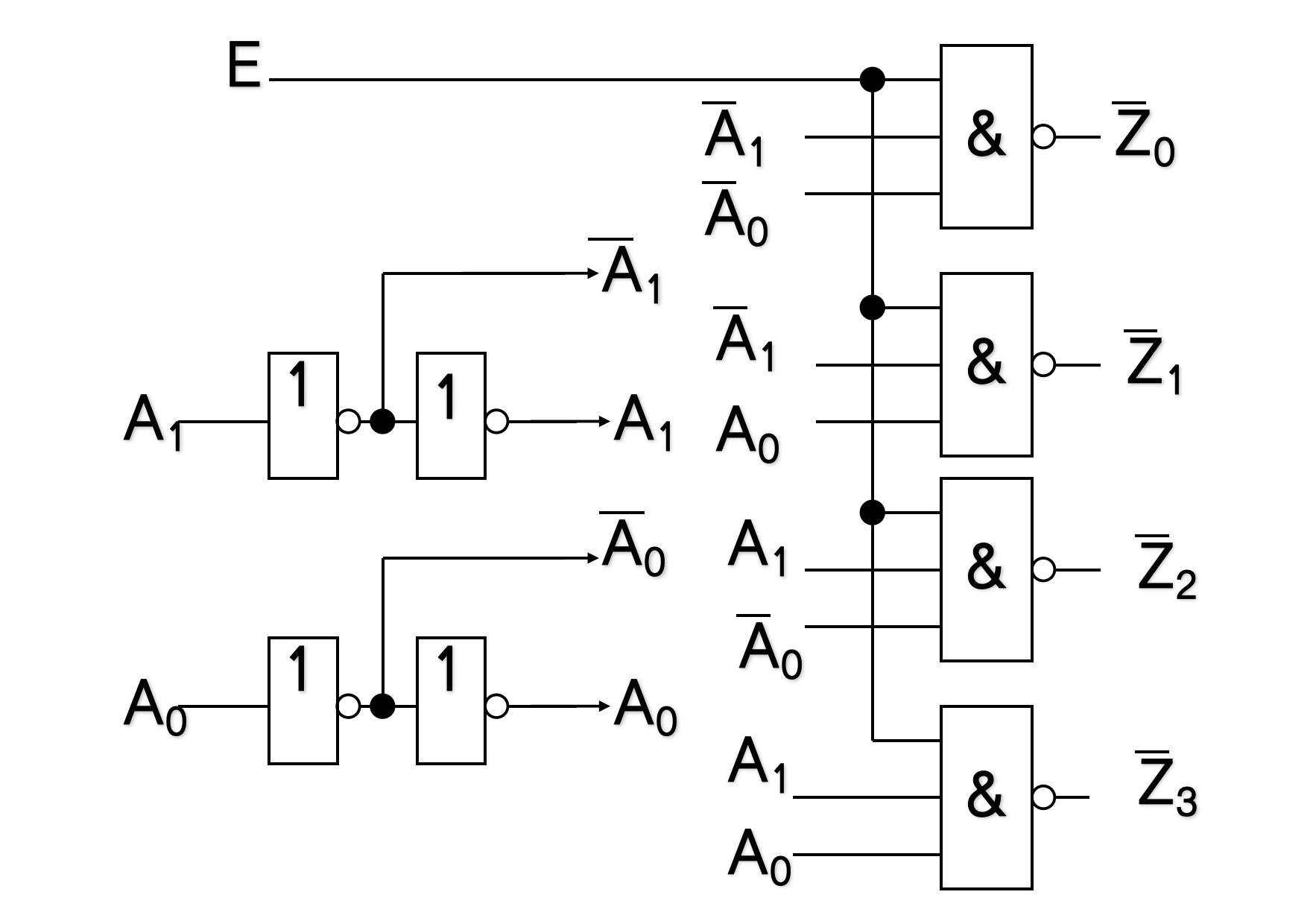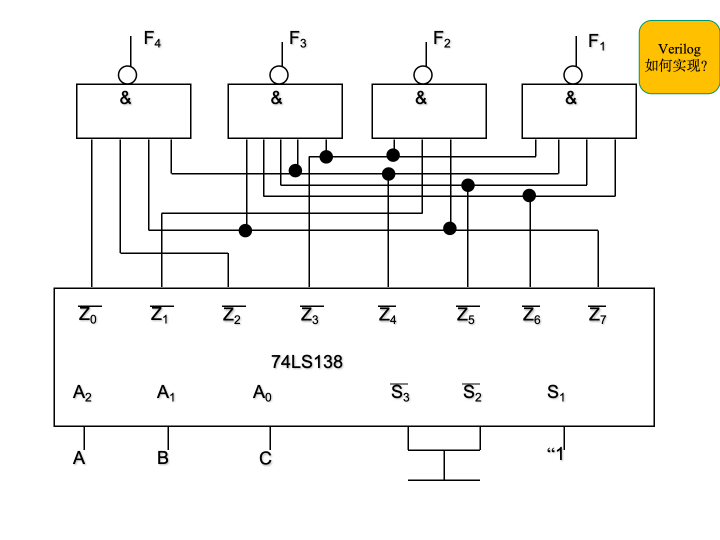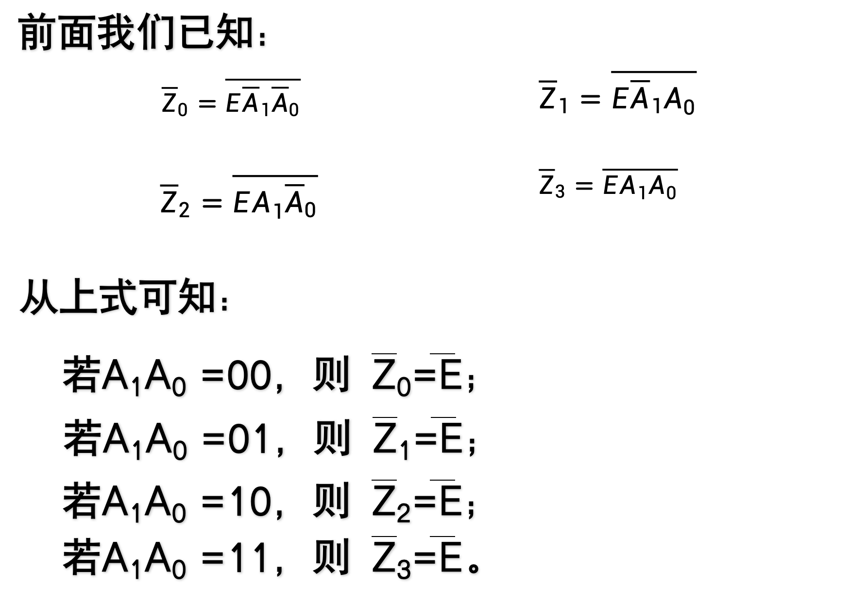 - 如果指定为低电平有效,那么使能端E为"1"时,译码器处于工作状态;