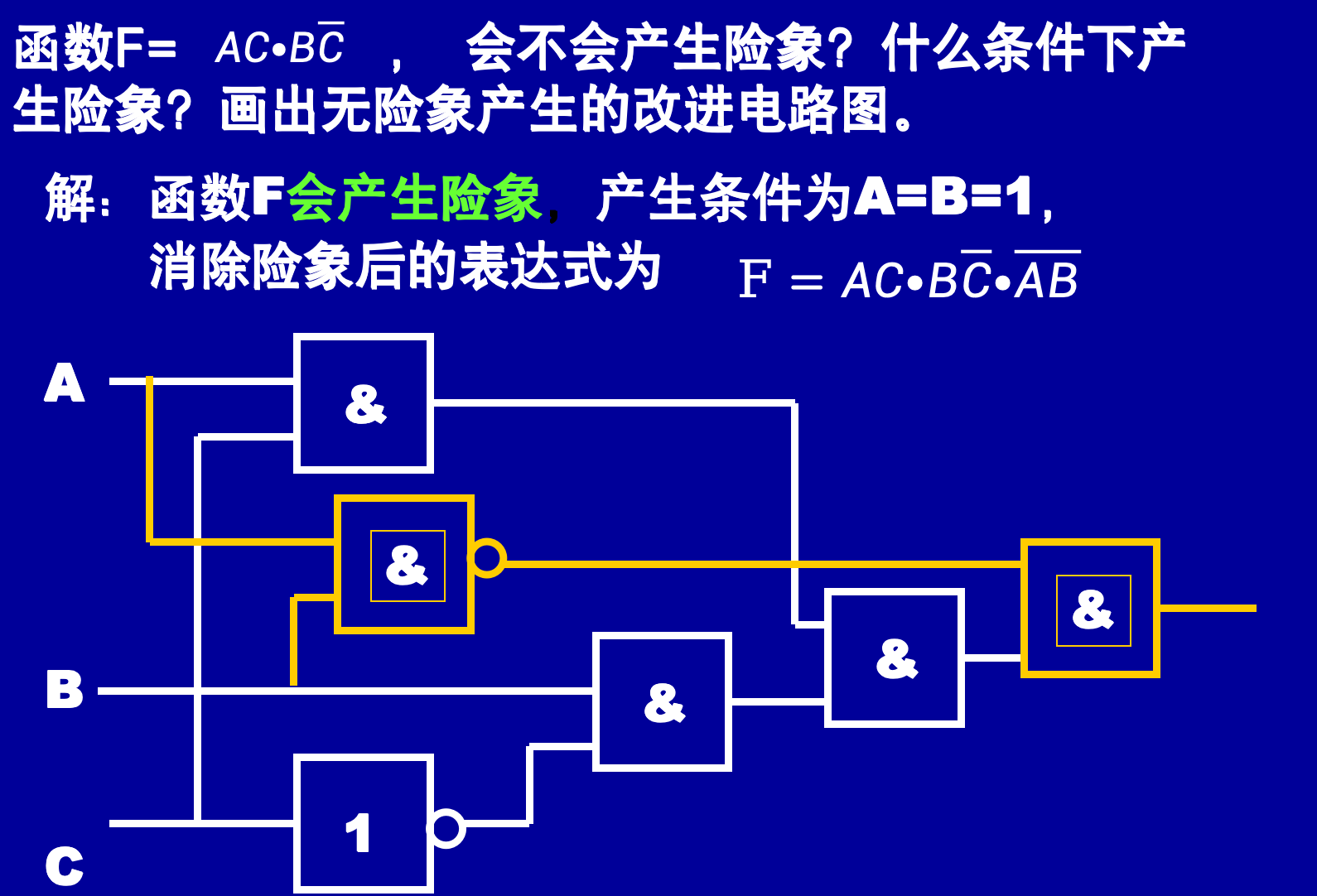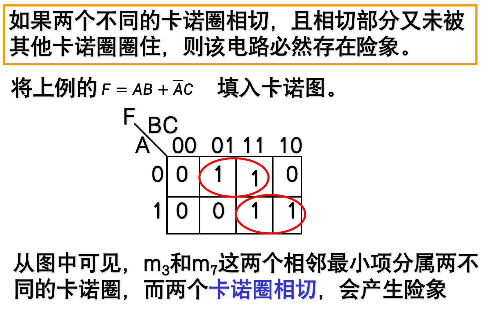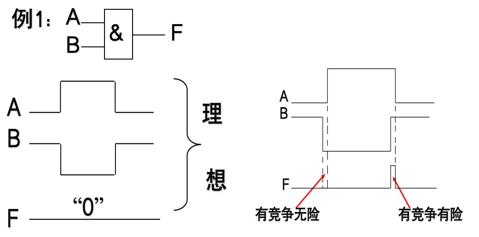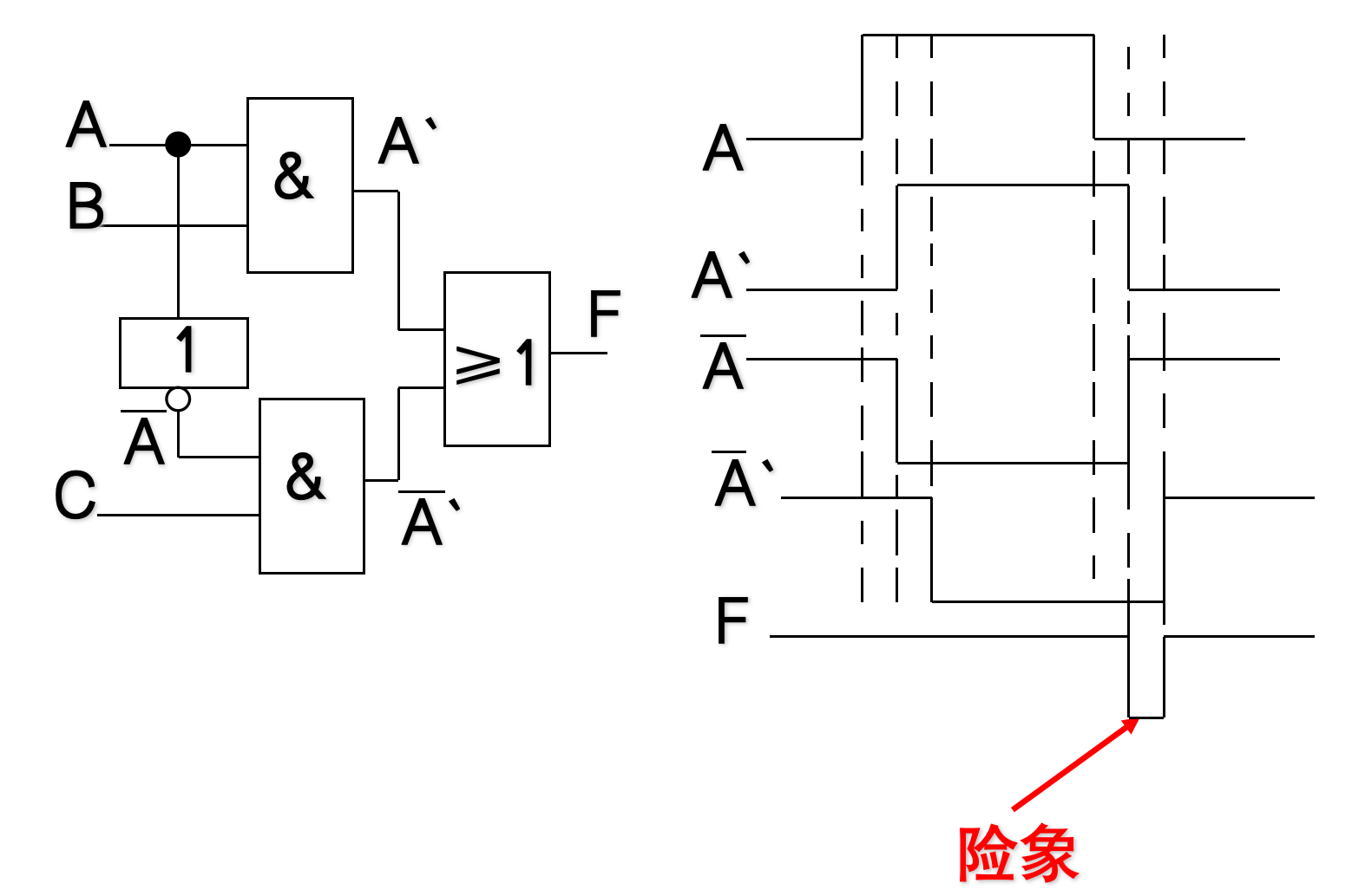 在逻辑表达式,令除了某个逻辑变量(如变量 A A A)及该变量的非(如 A ˉ \bar A Aˉ )以外的其它变量为某个恒定值后,若出现 A + A ˉ A+\bar A A+Aˉ 或 A ⋅ A ˉ A \cdot \bar A A⋅Aˉ ,则必然存在险象。