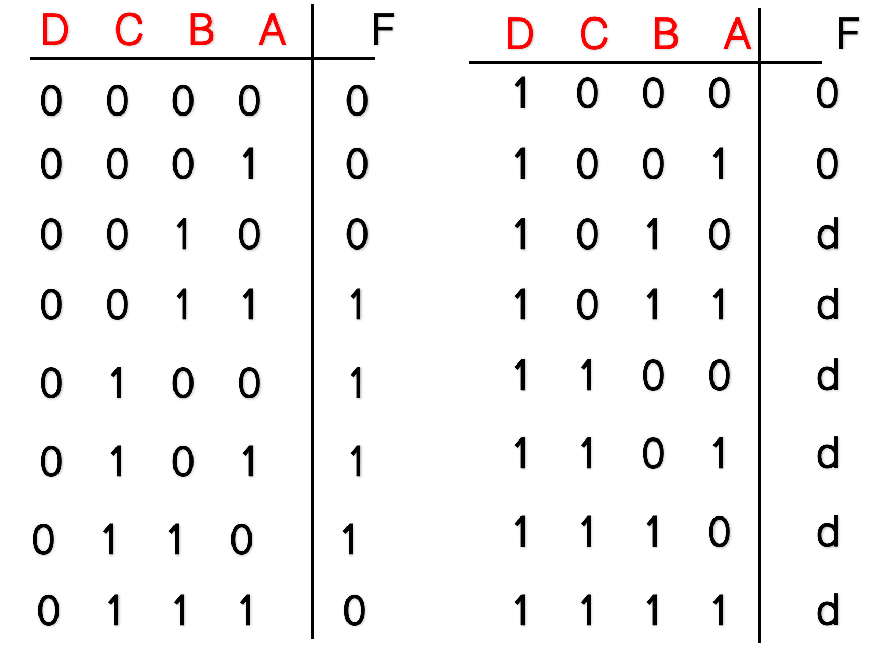 既然这些输入组合在实际电路中根本不会发生,那么它们的输出是0还是1就无关紧要(Don't Care),我们用"d"表示。