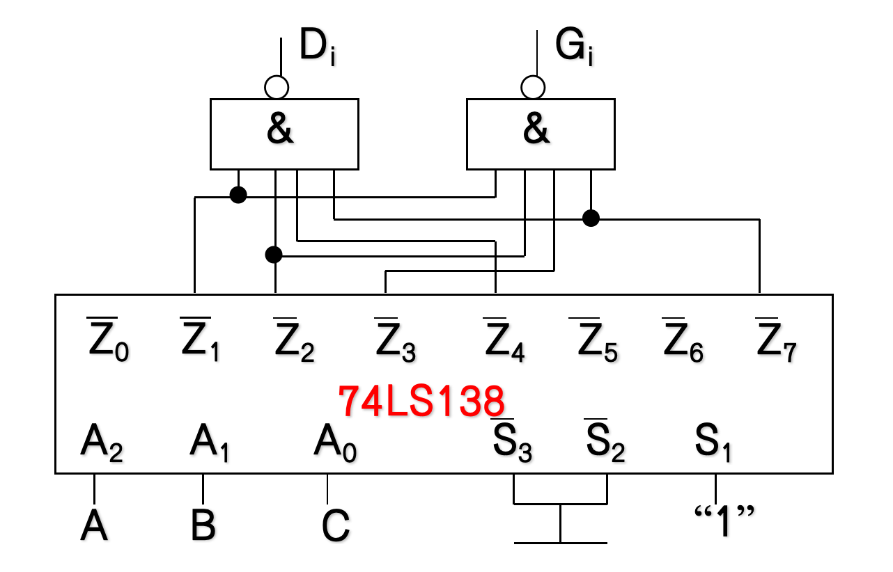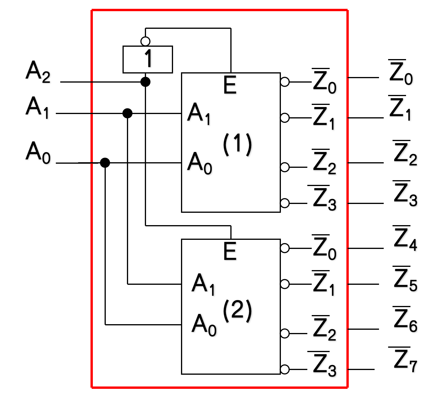 例:用两片2线-4线译码器扩展成3线-8线译码器。