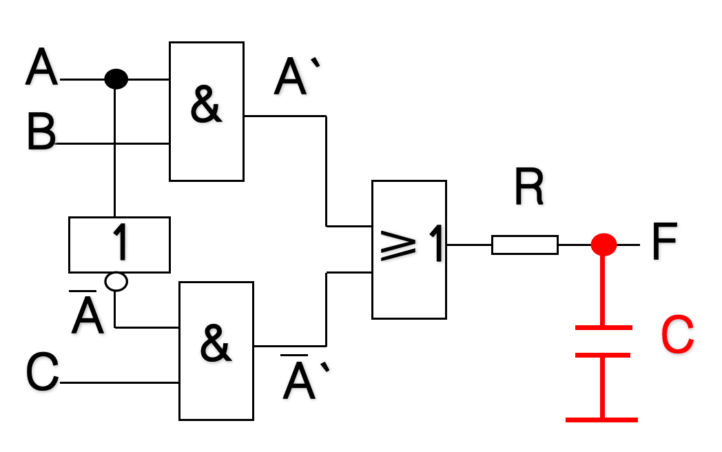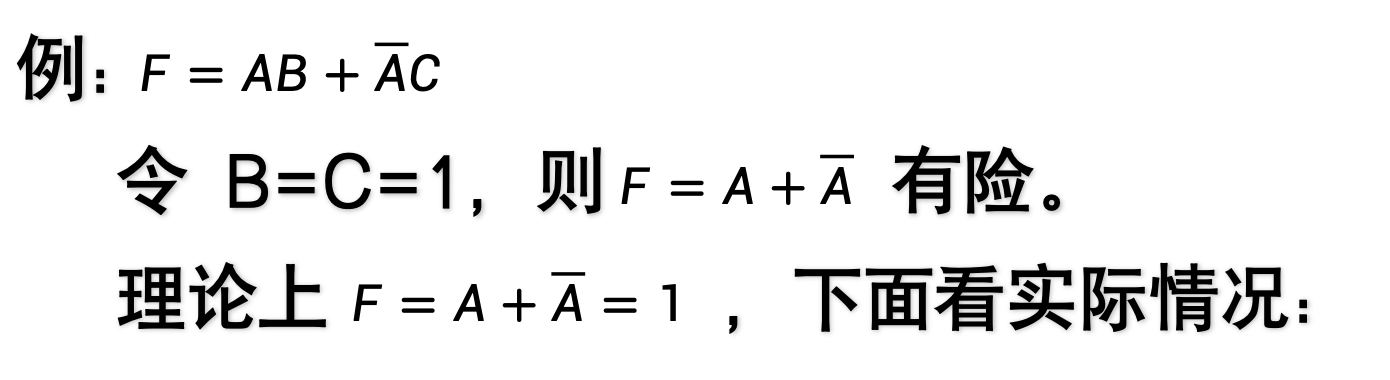 - 如 F = A B + A ˉ C + B C F = AB +\bar AC +BC F=AB+AˉC+BC,则当B=C=1时或门输出恒为"1",消除了"0"险象。