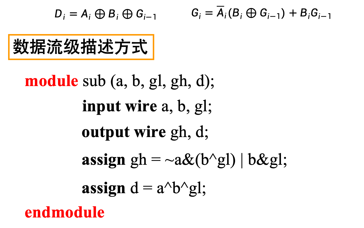 verilogmodule comp1bit (a, b, gt, eq, lt); input wire a, b; output wire gt, eq, lt; assign gt = a&~b; assign eq = ~a&~b | a&b; assign lt = ~a&b; endmodule -