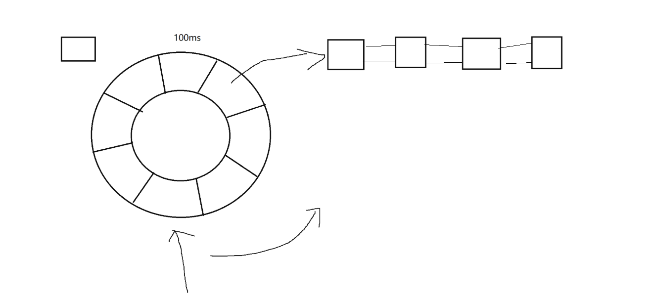 把时间划分为一个个小段,就是一个小格子,小段的粒度,看具体的场景。比如,将时间段为每100ms一次,而每一个格子上挂接这一个个链表,这一个个链表的节点,可能是 一个任务,每隔100ms,小格子都移动一格,尝试把对应任务执行一下,如图: