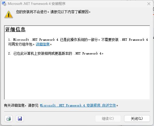 在 windows 11 操作系统上安装 .net framework 4.0,因为安装了 VS 2022 所以通过文件下载的文件包 dotNetFx40_Full_x86_x64.exe 无法安装如图