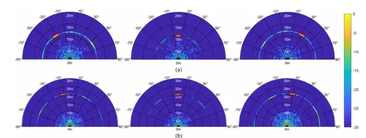 在三维空间扫描目标时,单个跟踪角度由方位角 / 仰角区间及其在虚拟天线阵列中的相对位置确定(见图 11)。车载应用中仰角天线数量较少,导致虚拟孔径小,限制了仰角方向的精准跟踪。为提升方位角分辨率,本研究舍弃所有仰角信息(假设仰角恒为 0°),以增大虚拟方位孔径(通道组合存在冗余)。图 18 汇总了同一环境下,RCS=134.2 平方米的角反射器在不同位置的二维距离 - 方位角 FFT 图谱:数据由 100 次测量平均得到,角反射器分别置于 10 米 / 20 米距离、方位角 ±6 米 /±4 米 / 0 米处。当反射器正对雷达时,首个栅瓣出现在预测的 + 41° 位置,该位置超出 ±30° 视场范围,因此不会导致雷达系统出现模糊度。但在长距离(自由空间路径损耗导致信号电平下降)且目标位于更大扫描角度(MIMO 方向图)的场景下,栅瓣可能进入视场,成为仅比真实目标弱 6 dB 的虚假目标 ------ 这也可能是大 RCS 角反射器与反射面共同作用的结果。尽管如此,该雷达系统仍可对 36 米范围内、±30° 方位角内的目标进行无模糊探测;对于更短距离,天线混响效应相较于增强的信号功率可忽略不计。