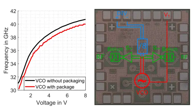 图1、930×930µm2压控振荡器(VCO)MMIC的封装和非封装调谐曲线和显微照片