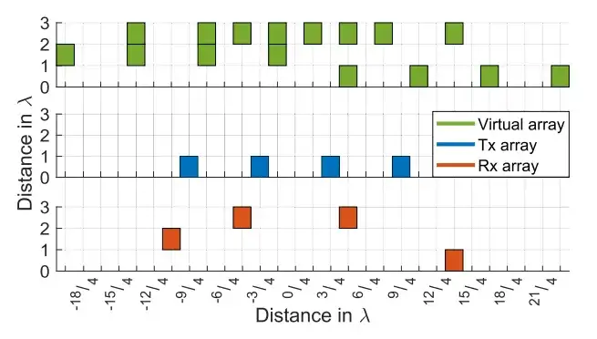 对 Tx 和 Rx 阵列(采用上述天线)的仿真结果显示,当目标位于仰角 0°、方位角 0° 时,多输入多输出(MIMO)方向图如图 13 (b) 所示:Tx 功率主要集中在仰角方向,Rx 辐射主要集中在方位角方向,因此组合后的 MIMO 方向图聚焦于 ±16° 的窄视场范围内。旁瓣(图 13 (b) 中绿色区域)电平低于−30 dB,实现了高旁瓣抑制与高分辨率的设计目标。