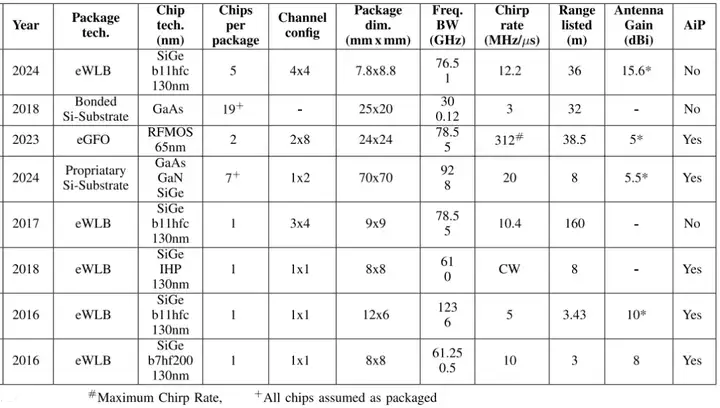 将这一理念拓展至混合信号领域,2.5D/3D SiP 可同时实现数字和模拟功能,且不牺牲隔离度、密度或性能。对多条重分布层(RDL)的精准控制,加之 RDL 包覆介质的高品质因数(Q 值),还能实现天线封装一体化(AiP)、线圈、耦合器或微机电系统(MEMS)等无源器件的集成。将这些元件(包括芯片和互连结构)嵌入封装,可使其免受环境损害,并提高Chiplet密度。与此同时,所采用的焊点简化了封装厂外的组装流程,且相比易脆的键合线连接,可靠性更高。这一点对高频接口尤为重要 ------ 高频接口的性能与反射和互连可预测性密切相关。键合线的长度不确定性会导致电感值难以确定,且需采用芯片腔体等昂贵制造工艺来缩短连接长度。而英飞凌的嵌入式晶圆级封装(eWLB)等高频封装技术,即便在 76--81 GHz 的车载频段下,也能克服上述问题,不过是以牺牲部分集成密度为代价换取更高性能。eWLB 技术自 2006 年开始发展,2008 年首次出现采用该封装的电路;2012 年,相关研究分别展示了首款基于 eWLB 的车载发射机、接收机和收发机芯片 - 封装协同设计方案。后续研究主要聚焦于提升工作频率、改善 AiP 性能以及研究封装可靠性。然而,与数字领域类似的多Chiplet方案却大多被忽视,Chiplet设计复用、输入 / 输出端口(如电源 / 地)共享、利用高 Q 值封装实现低损耗Chiplet接口,以及相比多芯片系统降低成本和尺寸等优势均未得到挖掘。本研究旨在弥补这一不足,提出一种可扩展的 4×4 雷达系统,其通道数量仅受封装技术最大尺寸限制。