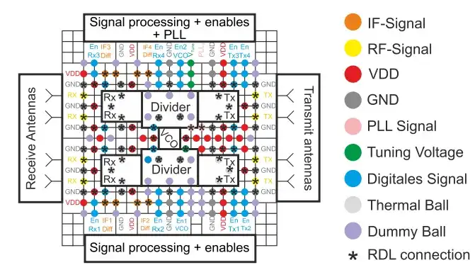 电迁移是第三个主要应力源,因此应力最大的焊球未用于传输关键信号。若不遵守这一原则,重分布层(RDL)可能扩散到焊料凸点中,形成空洞并导致电阻增大,甚至开路。但将射频输出端进一步移至封装内部会损害射频性能,因此折中方案是将其布置在封装边缘(避开角落),并额外增加一排焊料凸点以支撑该布局,这也导致封装的长宽尺寸出现 1 毫米的差值。根据剩余焊球的应力严重程度,部分焊球未传输任何信号或直流电流(即虚设焊球),这一设计尤其用于封装边缘和功分器周围。