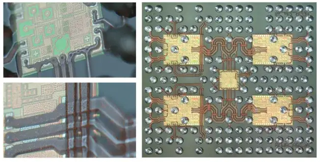 图5、整个7.8 mm×8.8 mm 4×4雷达封装的显微照片,突出显示芯片/RDL重叠