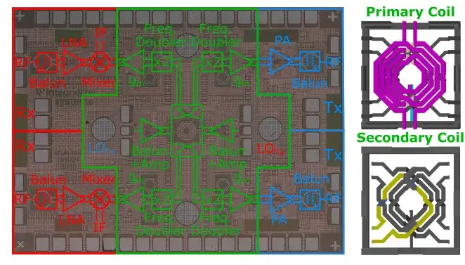 图2、1964×1448µm2 TRx MMIC的显微照片和拓扑结构