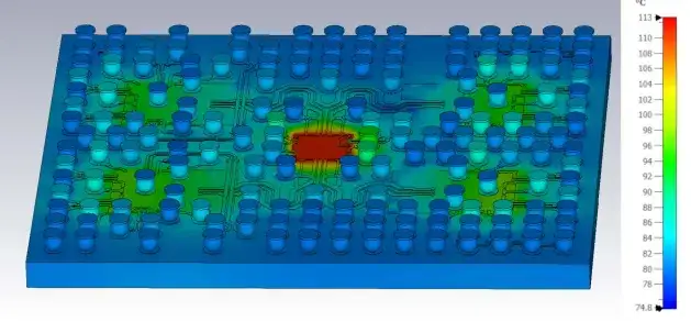 Chiplet被封装后,其直流功耗产生的热量可能难以有效散出。类似 PCB 在无主动冷却的情况下,基板温度经热像仪测量已超过 60℃。因此,本研究针对所有Chiplet同时耗电的最坏情况,对雷达封装进行了热稳态仿真(简化了 PCB 连接)。但在实际测量中,由于采用时分复用(TDM)技术且未使用的 TRx 处于关闭状态,这种最坏情况并不会出现。VCO 的功耗为 165 mW(3.3 V 供电,电流 50 mA),热仿真(图 8)显示其最高温度可达 113℃。尽管 Rx/Tx 的功耗(分别为 561 mW/891 mW)高于 VCO,但三个热接触点提升了散热效率,使其温度分别降至约 93.25℃/89.4℃。这些热接触点通过增大的过孔直接连接Chiplet顶层金属层(与接地端相连),并贯穿多个金属层和Chiplet衬底,助力热量传递。凸点下金属化层(UBM)进一步提升了封装的热导率和电导率,因其大尺寸垂直连接缩短了Chiplet与 PCB 之间的距离。