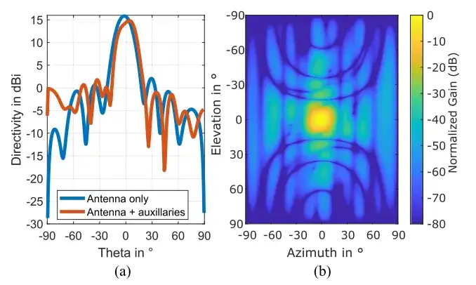 图13、模拟(a)带/不带辅助设备的一个梳状天线的辐射方向图和(b)MIMO辐射方向图