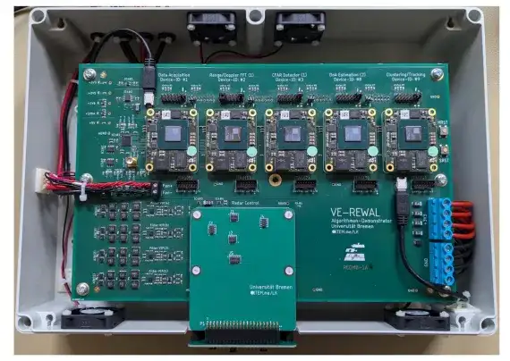 图 15 所示后端作为外设,连接前端、不同电源以及多个赛灵思现场可编程门阵列(FPGA)------ 这些 FPGA 各自承担部分数字信号处理(DSP)任务,形成额外的安全层。本研究聚焦硬件设计,仅使用 "数据采集" FPGA:该 FPGA 通过串行外设接口(SPI)设置前端配置和时分复用(TDM)使能,并对模数转换器(ADC)输出进行预处理,以供后续数字信号处理。为充分利用 ADC 采样范围,每个接收通道均配备专用的有源中频滤波器:初始带通滤波器衰减高频噪声和由 Rx 焊点反射 / 混响导致的低频虚假目标;恒增益放大器提升信号强度,同时根据弗里斯公式降低后续噪声影响。由于自由空间路径损耗(FSPL)呈现显著的低通特性,差分器将输出电压信号校正为 1/r 的衰减规律。后续的八阶无源切比雪夫滤波器(截止频率略低于采样频率fs的一半),可防止 12.5 MHz 的 ADC 时钟信号进入差分器反馈环路。与有源方案相比,该方案在去除高频寄生信号分量方面更具成本和空间优势。
