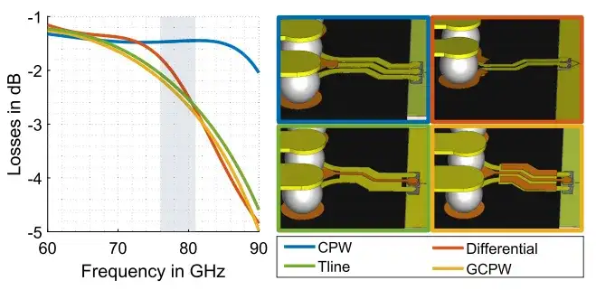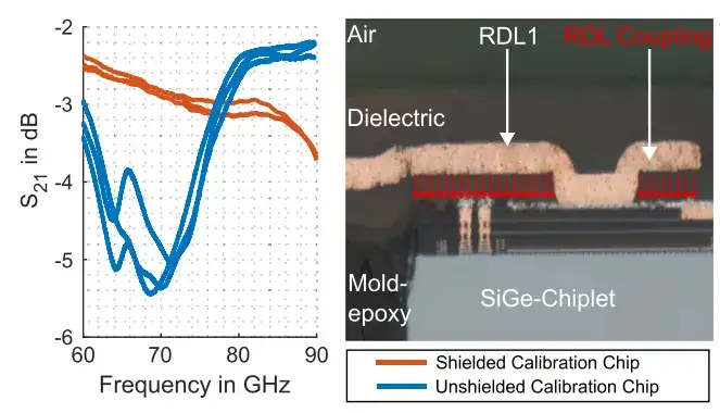 重分布层(RDL)与Chiplet顶层金属层间距较近,二者间的电容耦合可能导致封装性能下降,且下降程度与 LO 输入端距芯片边缘的距离成正比。图 4 通过评估共面(无屏蔽)和接地共面(有屏蔽)RDL 直通校准芯片的损耗,验证了这一现象:无屏蔽情况下,实测直通损耗偏差较大,而有屏蔽Chiplet则呈现出预期的单调损耗特性。尽管存在额外损耗,但第一节提及的功率余量足以避免对 TRx 性能造成显著影响。不过,为实现更可预测的 RDL 性能,仍建议对 RDL 进行屏蔽,使其与芯片表面隔离。