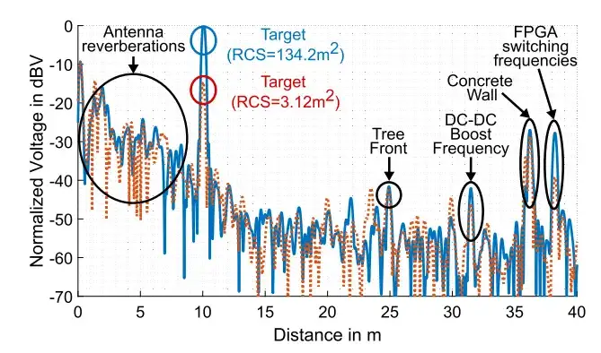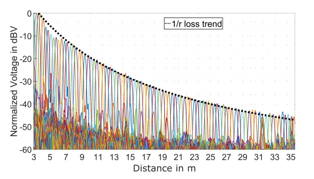 本研究在波鸿鲁尔大学的混凝土封闭室外区域,对安装在 3D 打印支架(增强机械支撑)上的雷达系统进行验证。采用两种不同尺寸(边长 21 厘米 / 8.2 厘米)的角反射器,其雷达散射截面(RCS)分别为 134.2 平方米 / 3.12 平方米,确保即使在近距离测量时也不会出现饱和。图 16 所示为 10 米距离下的快速傅里叶变换(FFT)测距结果,可见 RCS 差异主要导致电压电平偏移。低频段的天线反射、31.5 米处的 DC-DC 转换器干扰(2.5 MHz)或 38.3 米处的 FPGA 开关频率干扰(3.1 MHz),是该雷达的系统性限制因素。通过增加扫频时长或降低带宽(减小线性调频斜率),可将目标移至更低中频,而系统性误差保持不变,从而突破最大测距限制;环境目标(如 36 米处的混凝土墙、25 米处的树木)也会随之移至低频段,配合更高的放大器增益,可提升其可探测性。这一点在图 17 所示的移动反射器渐变数据采集测量中尤为重要:该测量未进行平均处理,因此未利用雷达系统的相干性。与虚假目标和系统误差的波动相比,目标的幅度和相位稳定性带来的 FFT 增益较低,导致自由空间路径损耗的 1/r 衰减趋势所对应的电压电平,仅比升压频率干扰高至少 10 dB。此外,由于未使用吸波材料屏蔽后端,近距离目标的混响效应清晰可见。