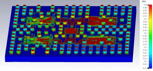 为确保应力合理分布,本研究通过机械仿真优化焊球布局。图 9 的仿真结果表明,单个焊球的张力与其相邻焊球的布局相关:Chiplet或封装边缘的触点承受的载荷最大。尽管多Chiplet封装中,单个Chiplet产生的应力可分散至更多 PCB 触点,使得该现象有所缓解,但功分器周围焊球的缺失仍会影响应力分散效果。因此,本研究增加了功分器和Chiplet周围的触点数量。