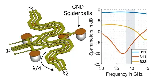 威尔金森功分器还为 VCO 提供接地连接,这是因为封装中心空间有限。尽管采用更小的焊球和节距(而非本研究中使用的 C4 球栅阵列,节距 500 μm,直径 300 μm)可能缓解这一问题,但会降低工艺可靠性并增加成本。所有焊点的焊盘尺寸也略有增大,以确保回流焊后具备良好的附着力。