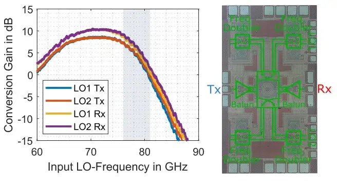 图 3 所示的分接芯片对整个 LO 分配网络的验证结果表明,无论通道(标注为 "LO1"/"LO2")如何,性能均相近,仅 Rx/Tx 模式间存在微小差异。该差异可归因于初级线圈绕组长度不同,导致其 Q 值降低,进而使倍频器的匹配特性失真。
