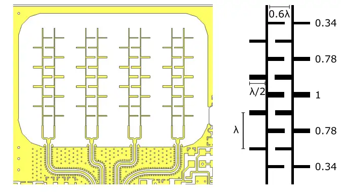 图12、利用天线短截线归一化泰勒系数的微带梳状线Tx天线阵列