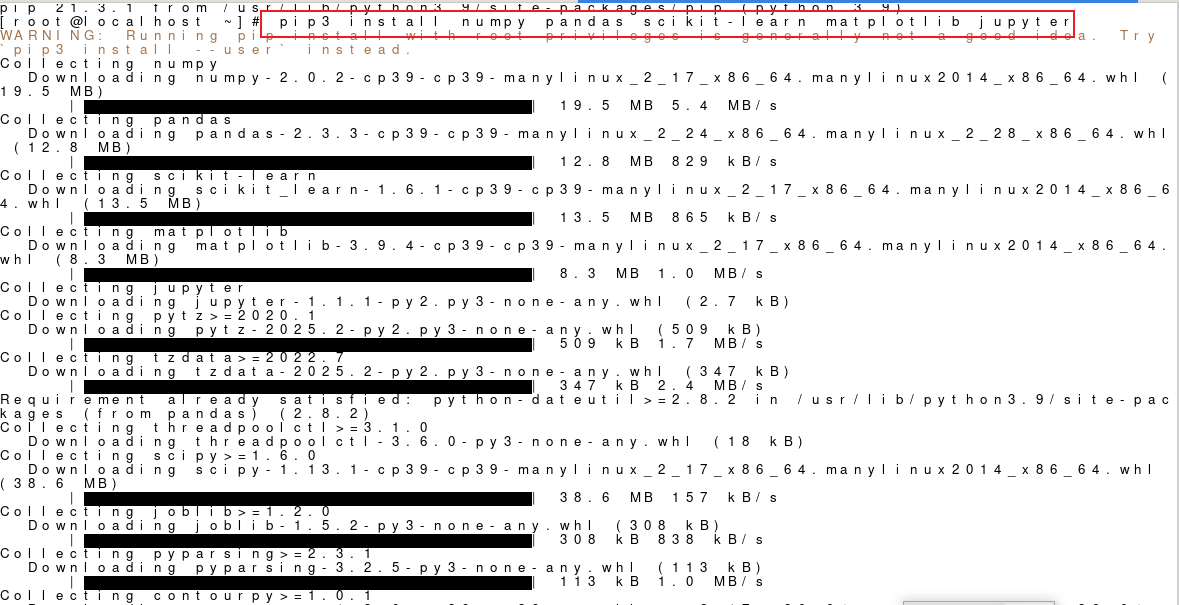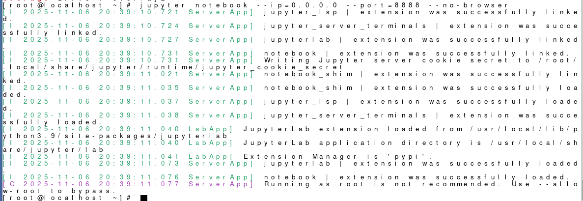 通过执行命令 jupyter notebook --ip=0.0.0.0 --port=8888 --no-browser 完成 Jupyter Notebook 的部署。从日志输出可见,系统成功加载 JupyterLab、终端扩展等各类组件,实现了在0.0.0.0网络接口(支持任意设备访问)、8888端口的无界面启动。该配置为数据科学开发提供了响应迅速、文件操作流畅的 Web 交互环境,可高效开展交互式数据分析、代码调试等工作,是数据科学开发的便捷利器。