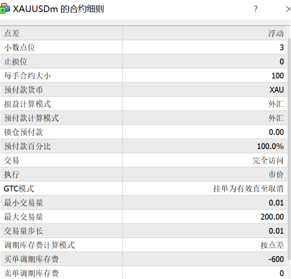 我们以XAUUSD为例,看看这个交易品种的合约情况,我们从MT4的交易品种属性可以看到信息,如下图:
