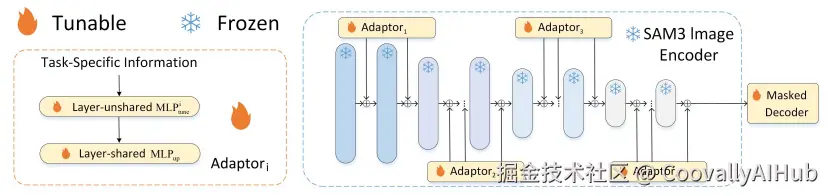 SAM3-Adapter 的核心思想是冻结 SAM3 的 Image Encoder,只训练 Mask Decoder, 从而实现高效的领域迁移。