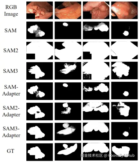 比如在医学图像息肉分割的定性结果对比中,原始 SAM 难以准确勾勒息肉边界,SAM2 甚至产生无意义输出。